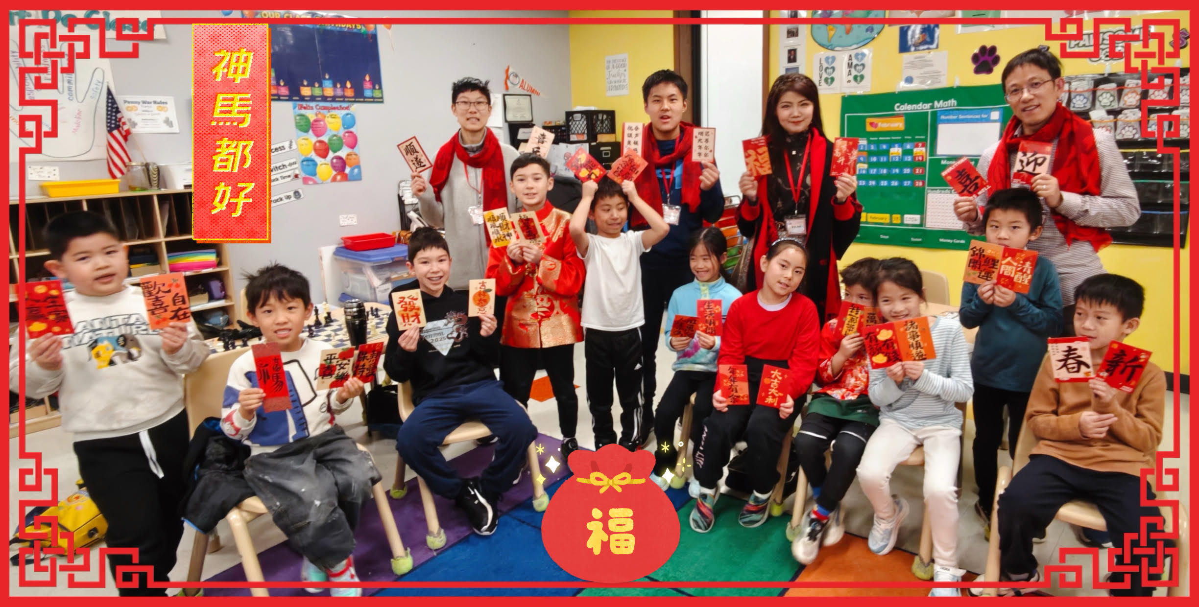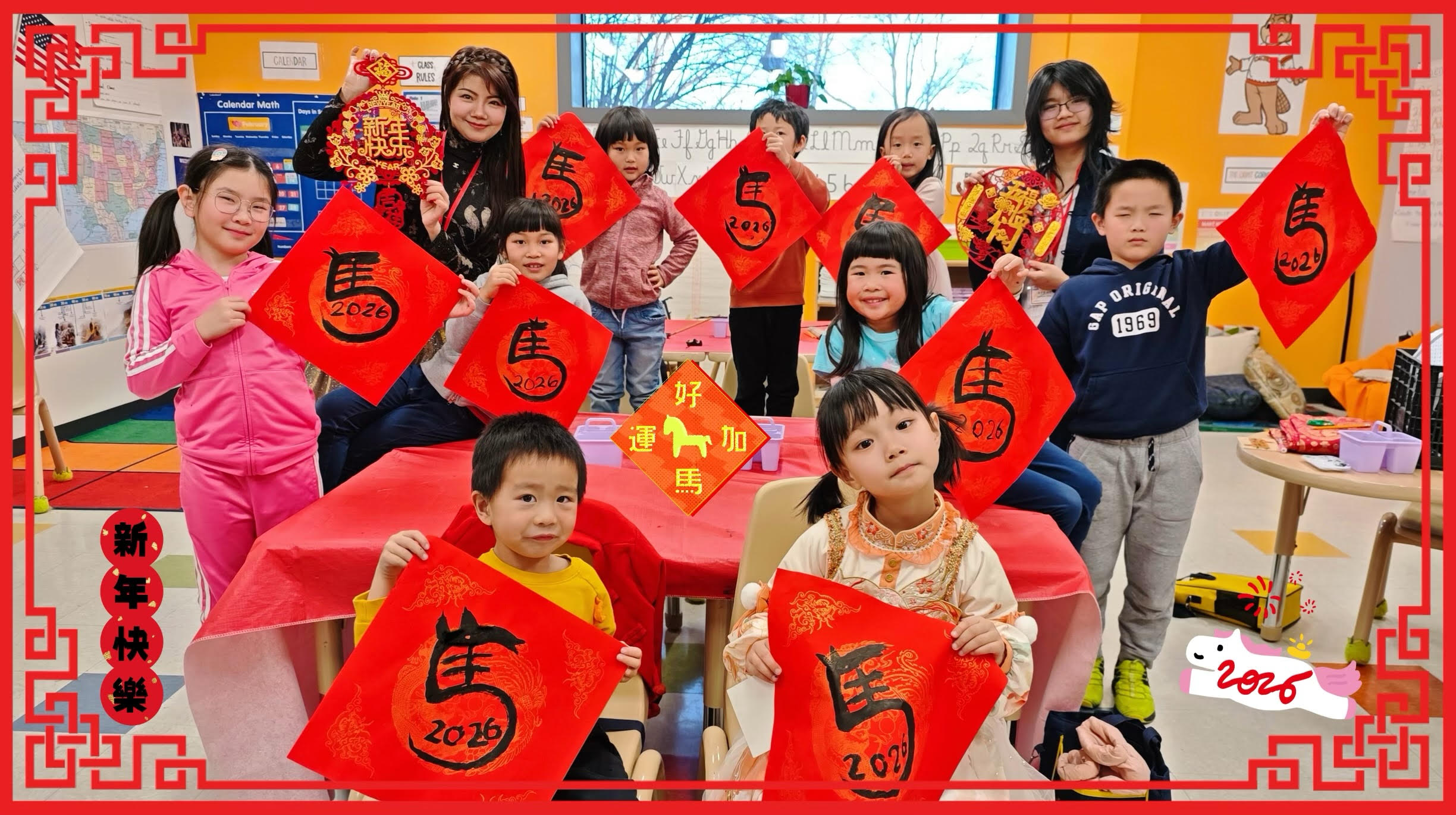 兴趣班同样洋溢着浓厚的节日气息。美术班的小朋友们发挥想象力,写出了充满童趣的创意毛笔字“馬”。一个个形态各异、活泼灵动的“马儿”跃然纸上,寄托着孩子们对马年的美好期待与祝愿;象棋班在新春氛围中也别具特色,老师寄语小棋手们在新的一年里继续享受对弈的乐趣,让棋艺“马”上进步,在 US Chess Federation 排名中不断提升,实现“马”到成功的心愿。